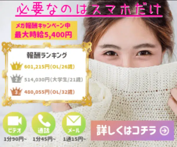 本気で稼ぎたい人は電話やビデオ通話などをする必要があると思いますが、少しお小遣いが欲しい人は1日1時間程度の稼動で無理なく稼ぐことができるのでおすすめです。